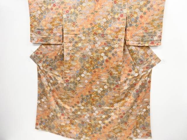 未使用品 流水に蛇籠・花・鴨模様織り出し手織り真綿紬着物【リサイクル】【中古】
