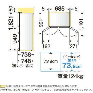 ・日本製【商品の仕様】■カラー:クリスタルホワイト■冷蔵室 ドア開閉タイプ:フレンチドア■冷蔵庫 ドア数:6■ノンフロン■定格内容積:600L{冷凍室101L、製氷室25L、瞬冷凍室37L、冷蔵室323L、野菜室114L}■寸法 外形:幅685×奥行738×高さ1821mm 据付必要奥行:748mm■質量:124kg■年間消費電力量:270kWh/年■定格消費電力 電動機:79W 電熱装置:234W
