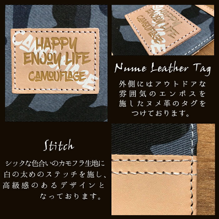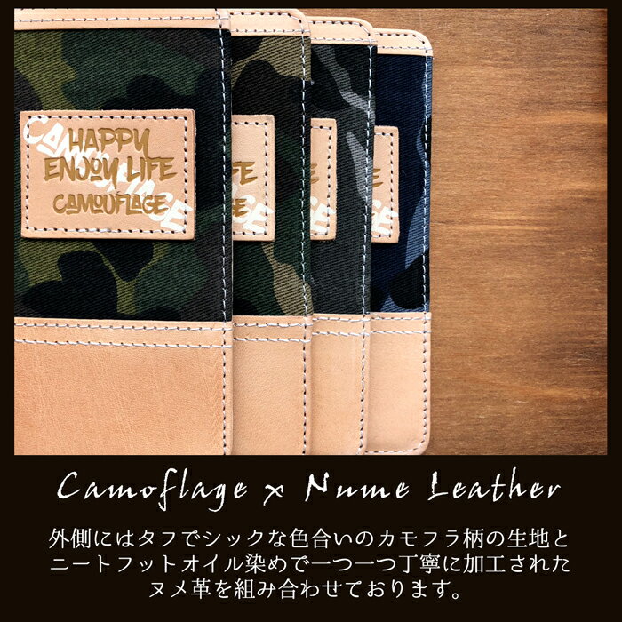 人気の迷彩柄とヌメ革のオリジナルデザイン手帳型ケースです。